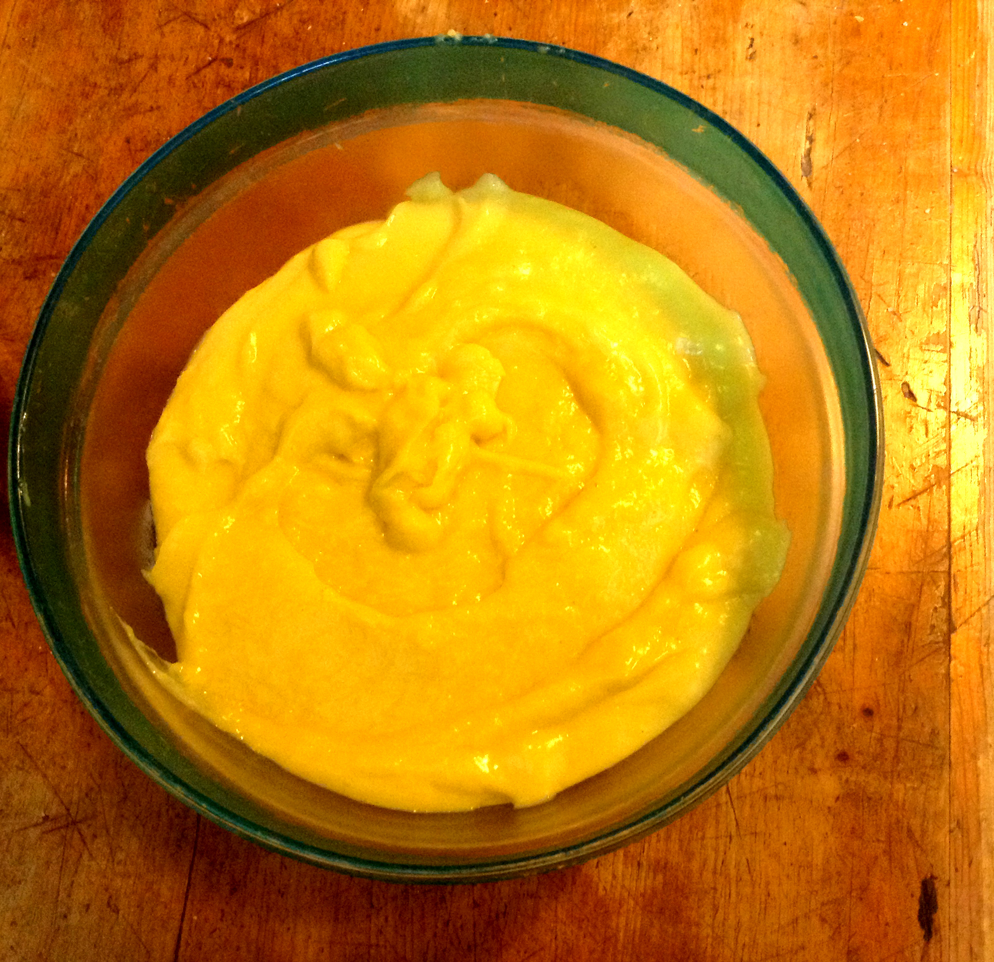 Prepariamo la crema. Uniamo l’amido di mais e il semolino di riso. Aggiungiamo 100 g di latte e otteniamo un composto liscio. Aggiungiamo lo zucchero, la scorza di limone (o arancia) e la curcuma e mischiamo bene. Intanto facciamo scaldare i restanti 500 g di latte. Quando questo è ben caldo uniamolo al composto precedente e mettiamo sul fuoco. Mischiamo continuamente perché in breve tempo la crema si solidificherà. Mischiamo bene con un mestolino di legno e quando ha raggiunto la consistenza della crema pasticcerà togliamo dal fuoco. Coprire la crema con della pellicola per non avere la crosticina in superficie, e fare intiepidire.